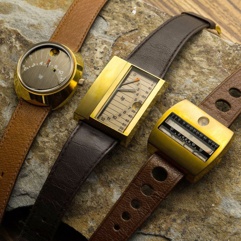 Innovative time displays including digital displays with mechanical movements, jump hours, displays for electromechanical movements, LED or LCD displays for quartz movements, fuel gauze type displays, horizontally oriented “driver’s watches.”