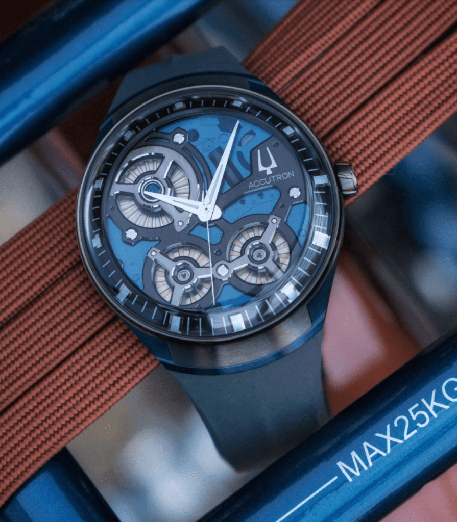 There is a thick curved sapphire crystal which follows the curve of the case and chapter ring. The case is mostly in dark gray steel except for a blue steel cutout at the lugs. There is an integrated rubber strap held in place with screws. The caseback has the Accutron logo and a rotor in relief. The crown is branded with the Accutron logo as well. The rubber strap is rather thick and highly curved with a deployant strap. The thickness and curvature of the strap along with the lightweight case make the watch sit fairly comfortably on the wrist. This may be one of the most comfortable watches of its size that I have worn. The overall shape of the tonneau case and integrated strap is reminiscent of the vintage Omega Speedsonic “Lobster” Speedmasters which notably featured a tuning fork movement.