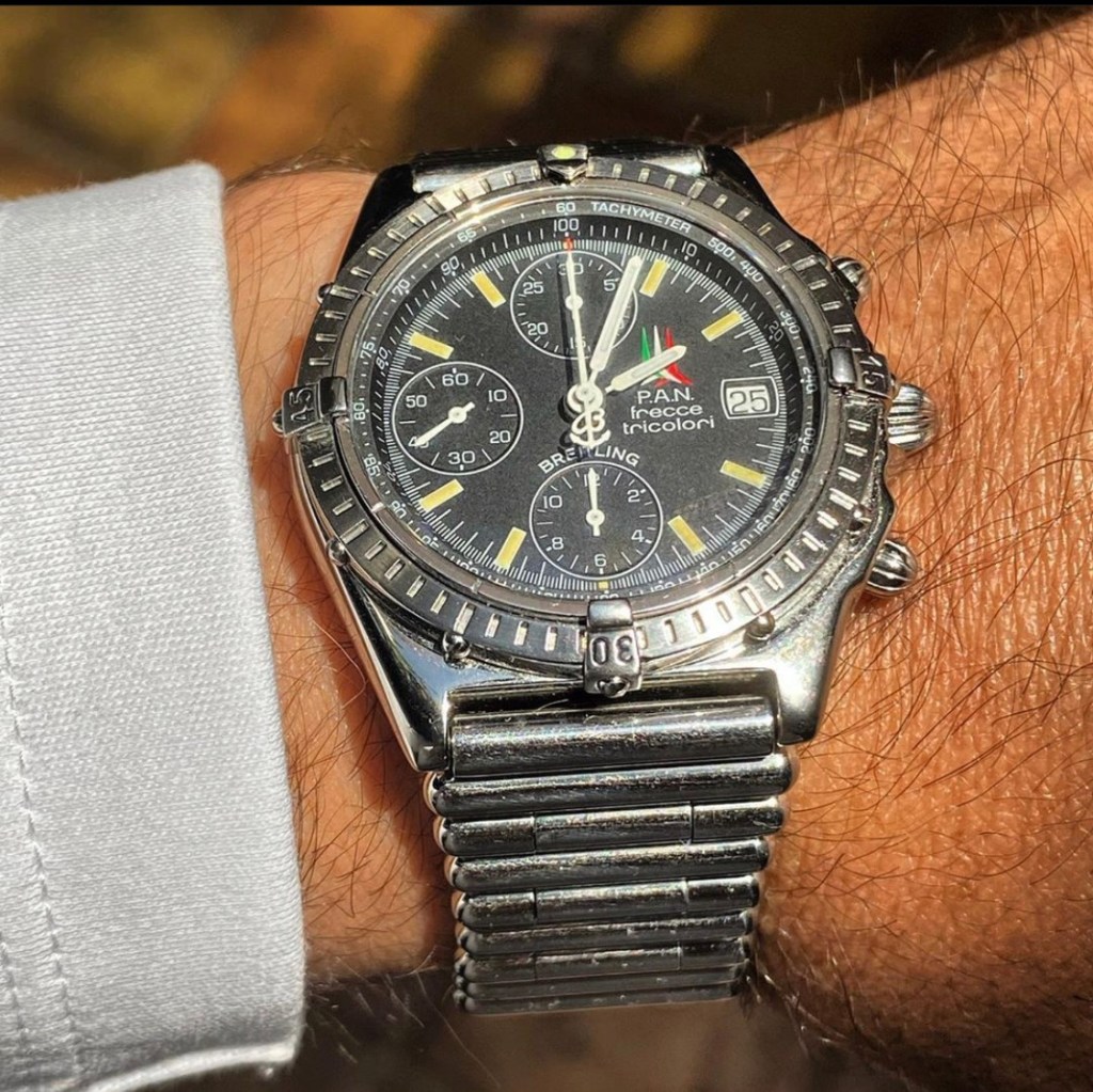 The 1984 Chronomat was the basis for the current model. It was transformed from a mathematician watch into an updated aviation watch. Perhaps the Navitimer design was too iconic to change so this line stepped in to become Breitling’s modern pilot’s watch. New design cues such as a rotating bezel with outer screws for easier grip, onion crown, and oversized pushers were created with input from the Italian version of the Blue Angels, the Frecce Tricolori. It is fitting that at a transitional point in their history under new ownership and with CEO Georges Kern, Breitling has again launched the Chronomat into a new era.