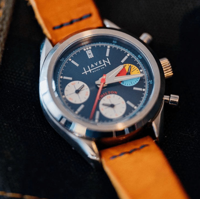 While the dial may seem to be the star of the show with its bright colors and striking design, I find the attention to detail in other aspects of the watch to be more impressive. The thoughtfulness in having drilled lug holes and including a bracelet and a strap really speak to the enthusiast driven approach of Haven Watch Co. The vintage sizing, titanium caseback, and the shape of the case provide a remarkably comfortable wearing experience. This is the closest of all modern watches to the feeling of a vintage chronograph on the wrist. It is hard to take it off! This is a wonderful first watch for a new small independent brand. When I first saw images of the dial I thought that Haven was an American Farer with its bright colors and strong value for money . After trying it on I realized that if anything it is even more of an enthusiast brand. If you like vintage chronographs, I urge you to take a close look at Haven.