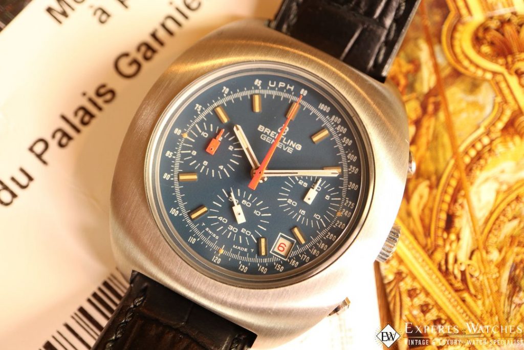 Breitling 7103. This was a manual wind 7740 chronograph with a long power reserve sometimes referred to as “Long Playing.” The chronograph module popped out and could be used as a separate stopwatch. Images from on Expertswatches.com, link here.