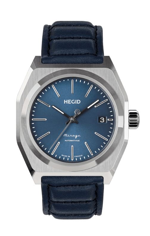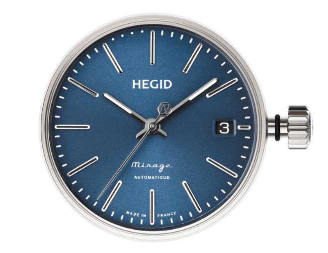 The Blue Mirage capsule is constructed in the same way and is interchangeable with other capsules. The price is 200 Euros more, but includes a quickset date at 3. The dial is blue with a subtle sunburst effect. The markers are sticks, and again the minute mark dashes are replaced by dots between 11 and 12. The hands are sticks and have lume except for the seconds hand which has a counterweight logo. ‘Hegid’ is printed with no logo above, and the print at 6 does not mention the 100 meters of water resistance. Overall the design is more simple and dressy than the Inaugural Series capsule.
