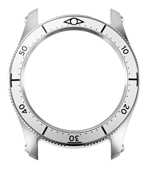The Vision Eclipse Carrure is their diver’s case with a rotating bezel. The case is in 316L steel and the bezel is anodized aluminum with a lume plot at 12. There is an eye shape around the lume plot for the “vision” theme. The bezel is bidirectional and has arabic numerals at 10 minute intervals with hash marks at 5 minutes. 15 and 45 has T shaped marks and the 30 has a line over it. One minute dots are also on the bezel. There is a satisfying click. The front of the case is brushed with polished sides and back. The outside of the spring bar holes in the lugs are decorated with black screw heads. These have no function as the lugs are not drilled through and the straps come with quick release spring bars.