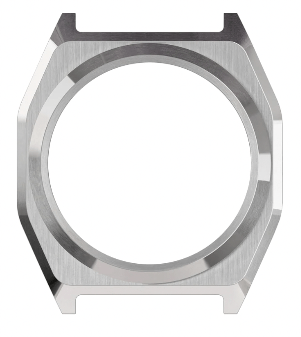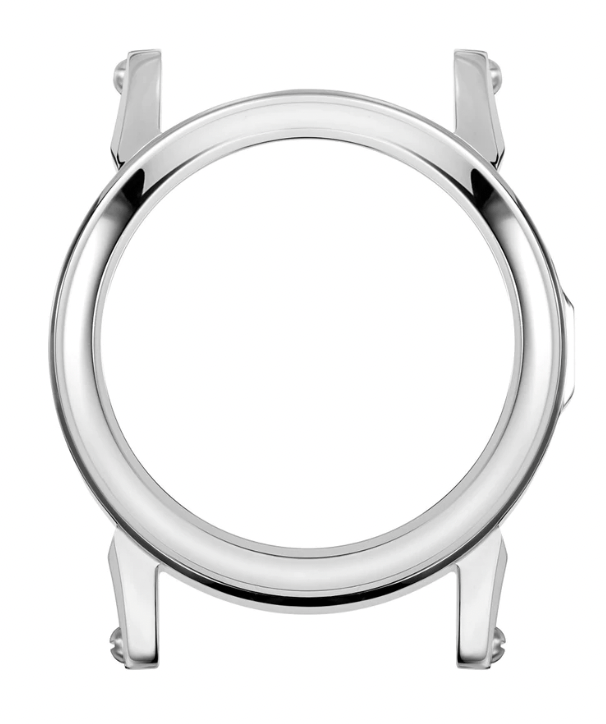 This case is more moderately priced and is a dress option. It is polished all around with no brushing. The lugs are relatively wide apart due to the 22 mm strap but emulate a fancy shape with some soft bevels and angulation where it meets the case. The decorative screw heads on the outside of the lugs are again present as part of the design language. The prominent lugs make it wear larger than expected.