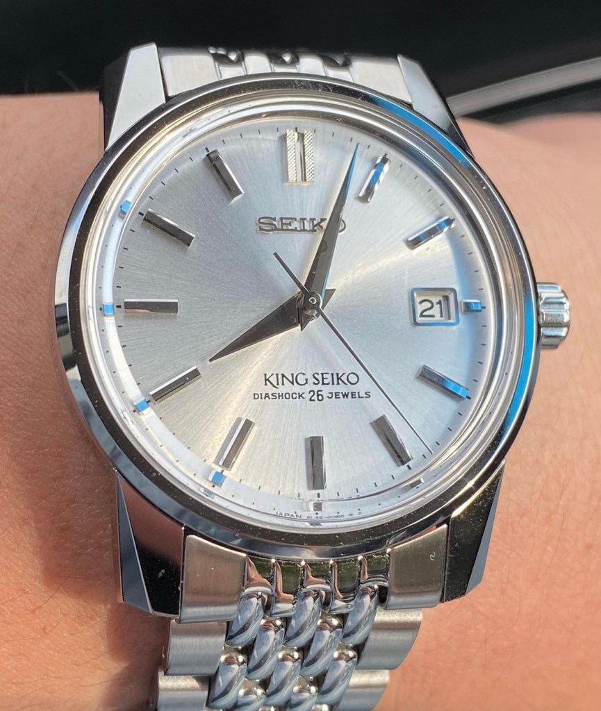 King Seiko needs no introduction here. David Flett has contributed original research to understand the familial relationship between Seiko’s Daini and Suwa factories, and therefore between the King Seiko and Grand Seiko. Contrary to the perception, in many cases (pun intended), Daini, creator of King Seiko, more closely adhered to Taro Tanaka’s Grammar of Design principles. In fact, the watch that is held up as the zenith of Grammer of Design is the 45GS which was derived from Daini’s 45KS. This is why the King Seiko reissue piqued my interest. At a lower price point you are arguably getting a more authentic Taro Tanaka experience, or at least more of a throwback to the original design intent. This watch is essentially a slightly enlarged version of the King Seiko 44-9990, also known as the KSK, made from 1964-1968.