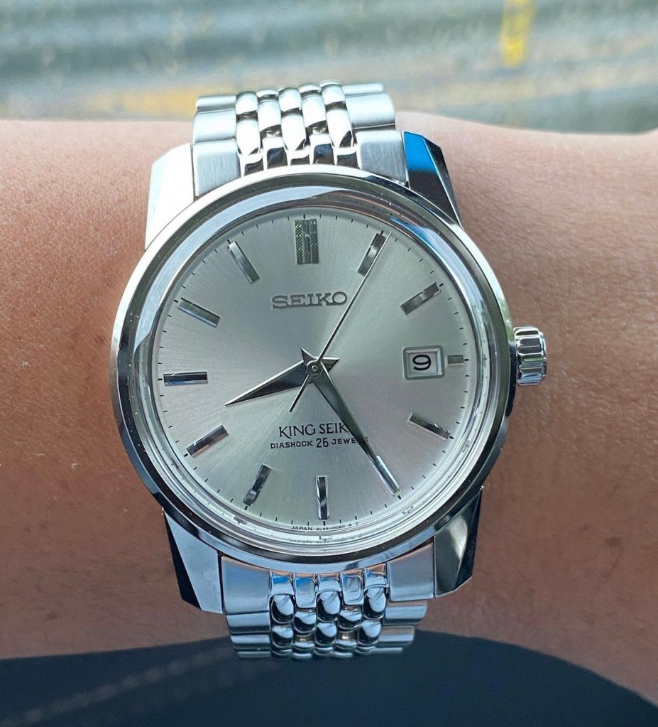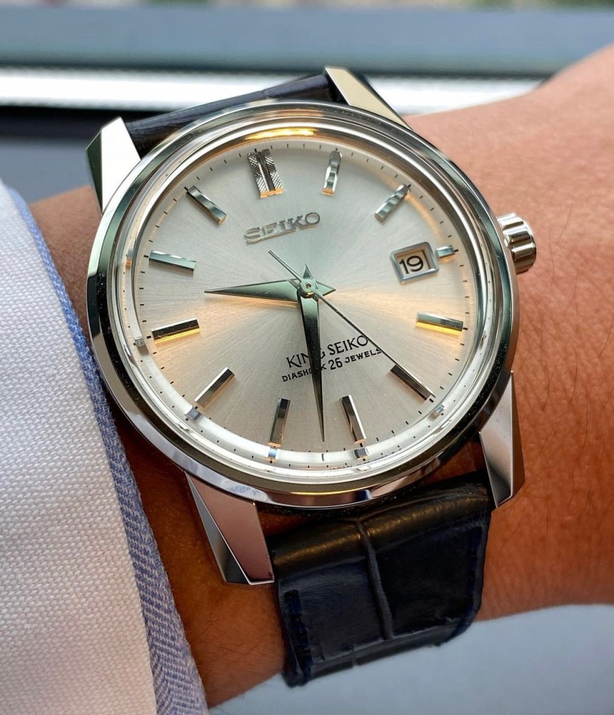 There is an applied Seiko logo at 12 and printed King Seiko Diashock 26 jewels at 6. The background is a beautiful silver sunburst dial. The remarkable finishing on the dial along with the case give a luxurious feeling to having this watch on the wrist.