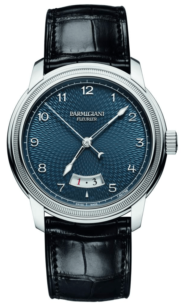 The Toric line is the company’s round dress watch. The special features are that the dial is blue with an interesting guilloché pattern and the case is in steel.
