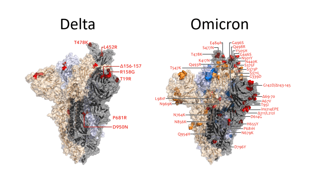 Omicron carries a large set of mutations including those in the spike protein (S glycoprotein), which is how the virus attaches itself to and enters a cell. Currently most of the world is dealing with a surge in the Delta variant, which is significantly more contagious than the original SARS-CoV-2 virus (1), has some reduction of vaccine efficiency against infections but vaccines remain generally effective against serious disease (2), and also seems to cause more serious disease, especially in the unvaccinated (3). As bad as it is, in a way Delta has had a good effect for the vaccinated. Since it is much more contagious, it has outcompeted variants such as Beta which have more vaccine resistance (2). In other words, variants like Beta have not been able to establish a foothold in the United States because the available hosts (mostly the unvaccinated) have largely been infected with Delta instead.