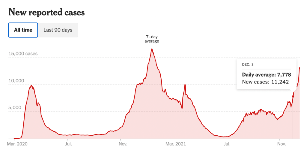 Meanwhile, there is a sadness mixed with grim determination in the air. Just when the memories of our first wave in the of Spring 2020 finally seemed to be receding, the news of hospitals being overwhelmed and broadway shows going dark because of breakthrough infections among the cast is difficult to accept. Our reopening was hard fought and a shutdown, although at this point existing more in our minds than in the law, is a bitter pill to swallow.