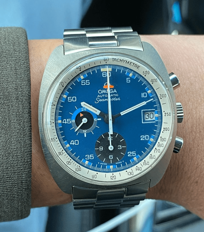 Ok so Heuer here is like, screw it, let’s just put the date at 12. None other than Jeff Stein pointed out that the seconds totalizer hand therefore obstructs the date view pretty much all the time unless the chronograph is active. It is powered by a Landeron 189 and was only made for about 2 years, probably because no one knew what day it was. I do like that it has a 45 minute counter instead of the usual 30.