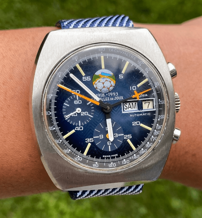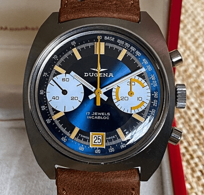 This appealingly asymmetric watch is also powered by a Landeron 189 and has a 45 minute totalizer subdial at 3 and the date over at 9. This looks slightly weird, probably because the Rolex Datejust has us all looking for the date at 3. But why not at 6? It’s just as arbitrary, except that if you pull your wrist out from under a sleeve it is the last thing you see instead of the first. Maybe Rolex was onto something. Anyway, the date at 9 is pretty unusual and this was cool enough to be reissued as a Hodinkee edition.