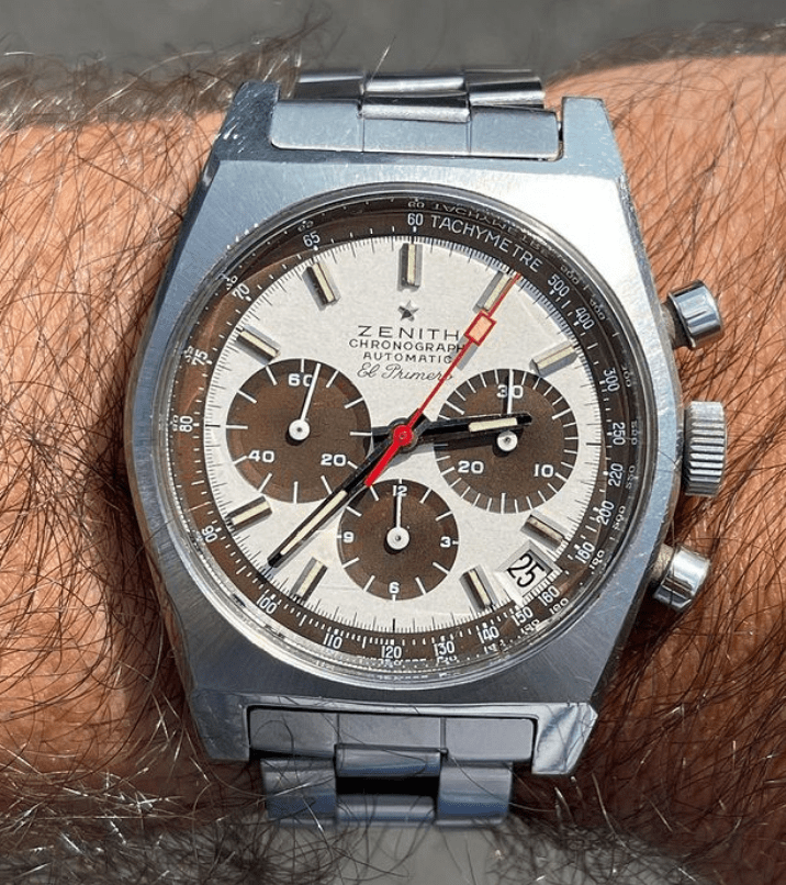 The dreaded 4:30 date! Here’s the problem with the date in a chronograph with subdials at 3, 6, and 9. I suppose the natural thing to do is to put it at 12, but as we noted with the Heuer Dato version 1, the date is obstructed by the seconds totalizer hand. So the options are to stick it on the side somewhere, either 4:30, or 7:37 and 30 seconds, or somewhere between 10 and 2. 4:30 just seems somehow arbitrary but I guess if you are making a first automatic chronograph you want all the bells and whistles, including the date. Notably, Rolex ditched the date when they used it in the so-called “Zenith Daytona.” Zenith usually make the window slightly trapezoidal and sets the date to follow the edge of the track rather than straight up and down which I think helps a little bit.