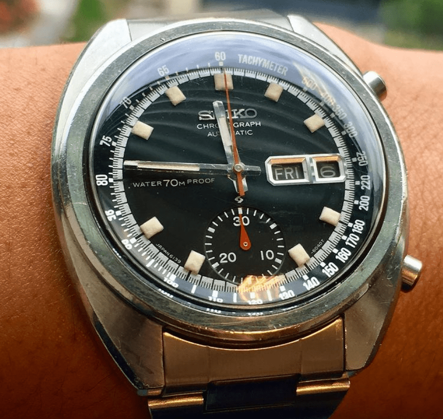 Seiko also went with 3 for the 6139 chronograph, putting the minute counter subdial at 6 and doing away with the running seconds hand. I personally like to complain about the 6139 movement while it is a vertical clutch pioneer and has a quickset day date (push in the crown lightly for the date, deeper for the day), it has no hand winding and no running seconds to tell if it’s working. I find the combination a bit annoying because I’m not sure if it’s running when I pick it up and I can’t wind it to make sure it has some power.