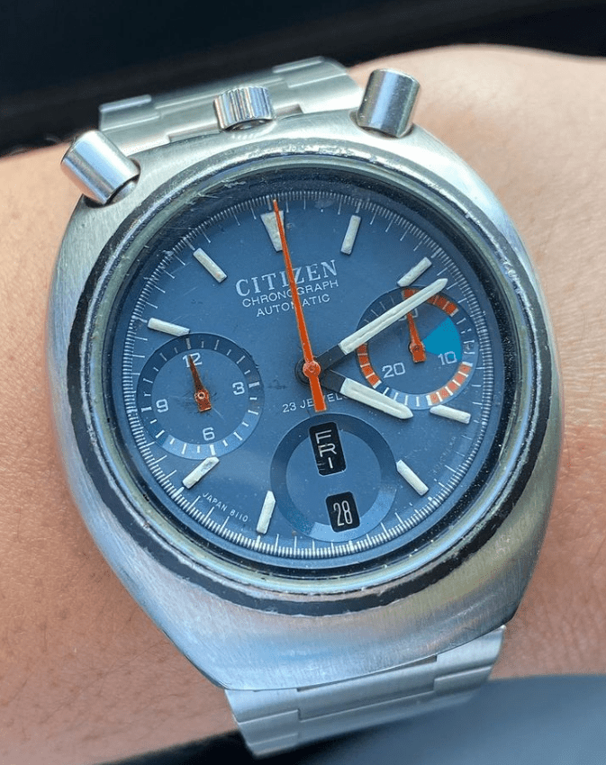 Brad Pitt wore a gold-plated Challenge Timer on a bund strap in the film Once Upon a Time in Hollywood so these have had a bit of a revival recently. In fact, Citizen recently reissued them in a quartz JDM model “Record Label Tsuno Chrono” that is closer to the original in size and design than the larger quartz “Promaster Tsuno Chrono Racer” bullhead that is part of their US lineup. Oddly, the Promaster version put the date at 1:30 due to an alarm on/off indicator at 4:30, while the most recent reissue has the date at 4:30.