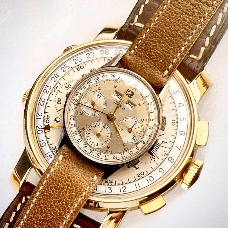 The Chrono-matic movement was the OG “collab” watch, except it was a collaboration for a purpose. Breitling/Heuer/Buren/Dubois Dupraz/Hamilton worked together to create their candidate for the first automatic chronograph. Like the El Primero and Seiko 6139, it also features a date. They chose to create a two register chronograph with minute and hour totalizer subdials at 3 and 9 but leave out a running seconds in exchange for a date at 6. I have the same issue with these movements as I do with the Seiko 6139 which is that you can’t tell if it’s running unless you active the seconds totalizer on the chronograph. At least you can hand wind this one and the date at 6 looks more natural for a two register chronograph.