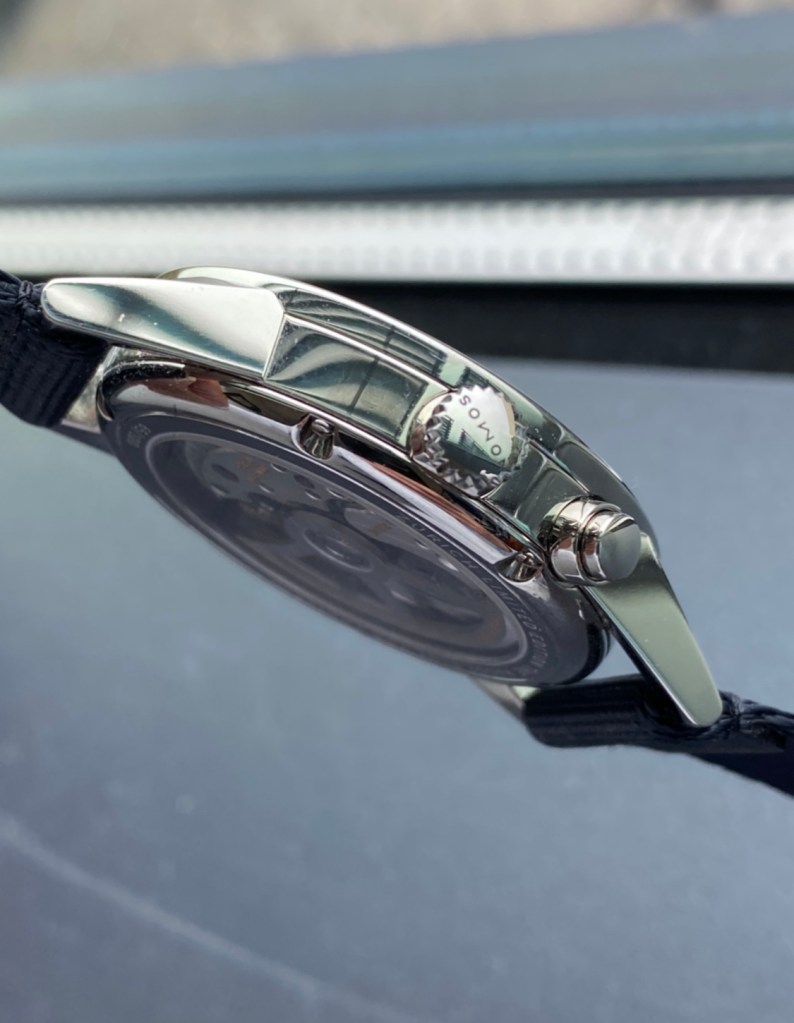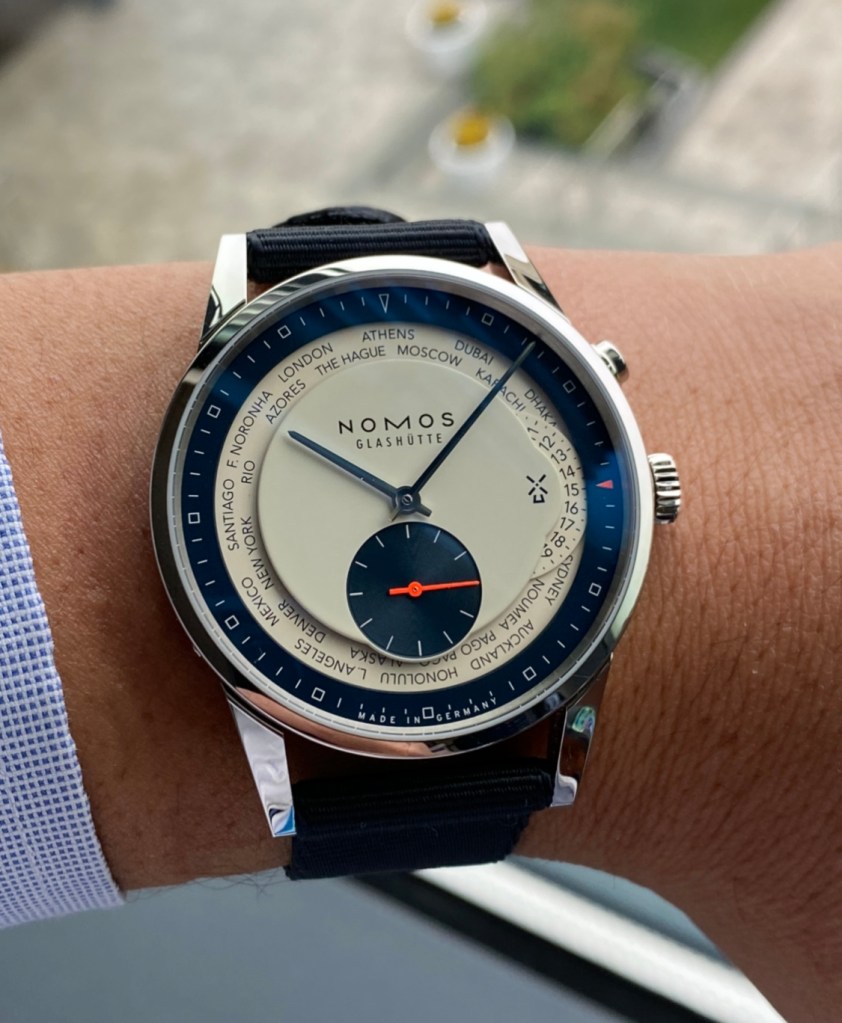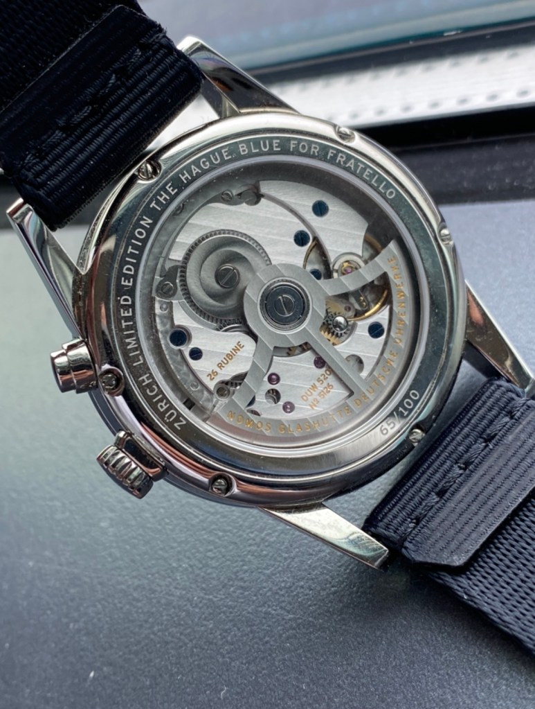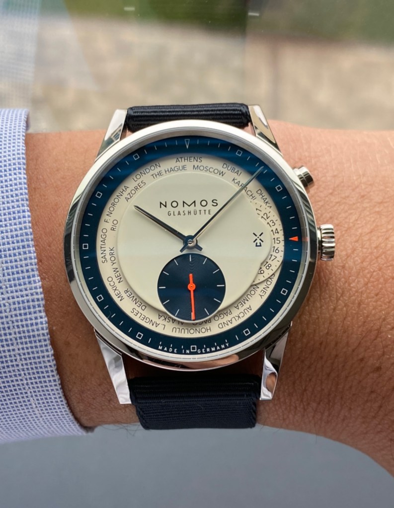Overall I love this watch. I think the standard models are a bit too reserved in terms of their dial color and design but the blue panda really pops on the wrist. Like other Nomos designs, the lugs tend to be a little long, and the inward angle makes fitting an aftermarket bracelet a bit awkward. The thinness of the case and the downward turn of the lugs keeps it from wearing too large. In addition to the OEM sailcloth strap, it works well with an Erika’s Originals strap when pulls it down and close to the wrist. I am a fan of the standard Nomos bracelet which I ordered separately. Check my Instagram to see how it looks when it arrives.