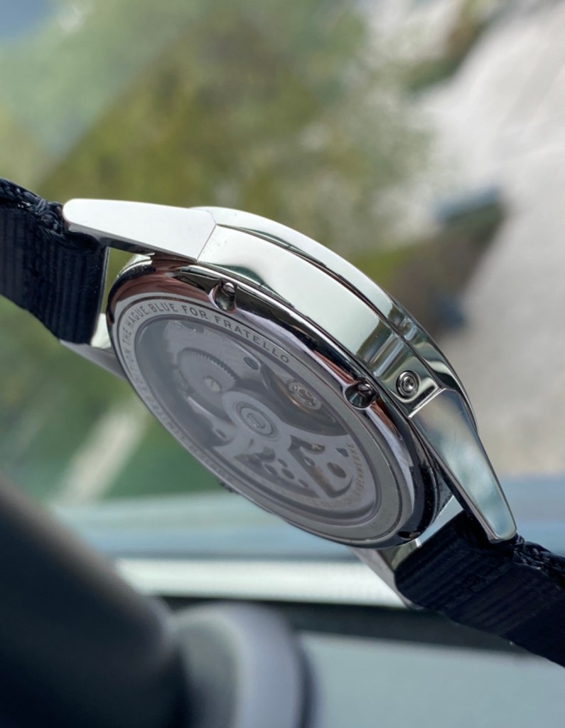 The strap is a soft and comfortable Nomos branded sailcloth strap with a double-sided buckle, giving it a bit of a sporty look. There are surprisingly few holes so I had to punch a couple of extra ones for my 6.7 inch wrist.
