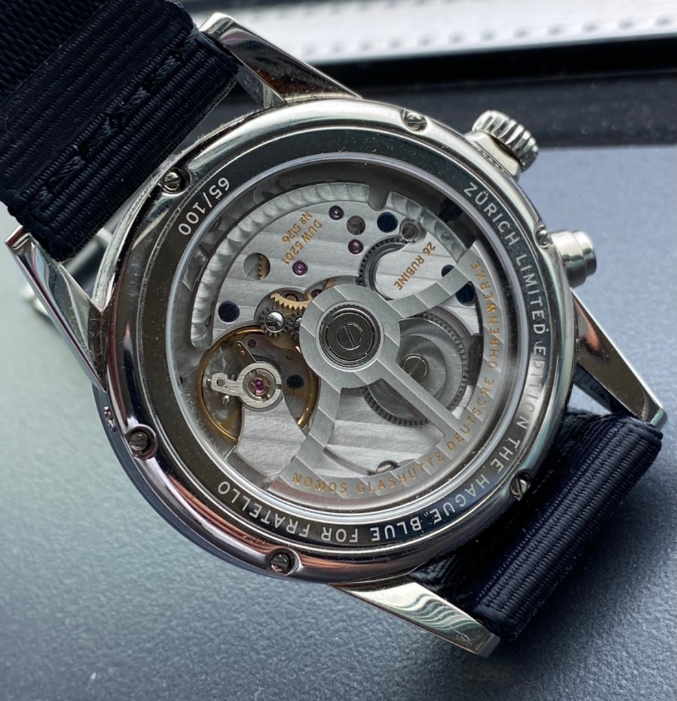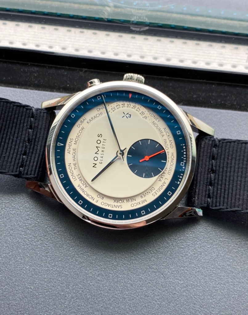 This is the second limited edition panda dial Weldzeit collaboration between Nomos and Fratello. The first panda dial had only 25 pieces which quickly sold out. This blue version came in 100 pieces. Besides the special dial, this Nomos is notable for the the DUW 5201 caliber. It is not exactly a “world timer” in the conventional sense since the various time zones are not displayed simultaneously. Rather, it acts as a “flyer GMT” with a jumping local time hand while simultaneously displays a city corresponding to the time zone.